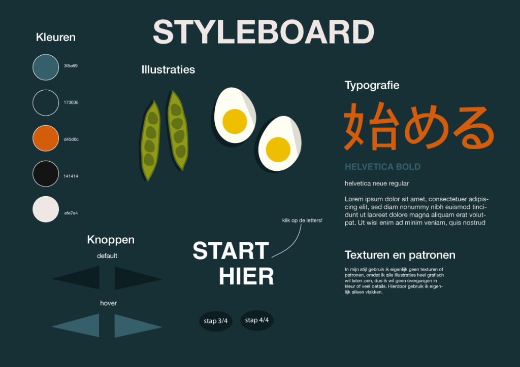 Hieronder staan de ingrediënten en het styleboard dat ik ontworpen heb. Ik heb deze stijl gekozen omdat ik het een chique uitstraling wilde geven, dat heb ik gedaan door een donkere achtergrond. Ik wilde het toch nog wel duidelijk laten zijn wat het voorstelt dus vandaar de grafische illustraties.