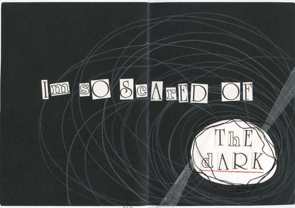 Dit werk spreekt eigenlijk wel voor zich. Ik ben al mijn hele leven best bang in het donker en op deze pagina heb ik dat uitgebeeld, de tekst ’the dark’ heb ik express in het licht gezet om het nog interessanter te maken.