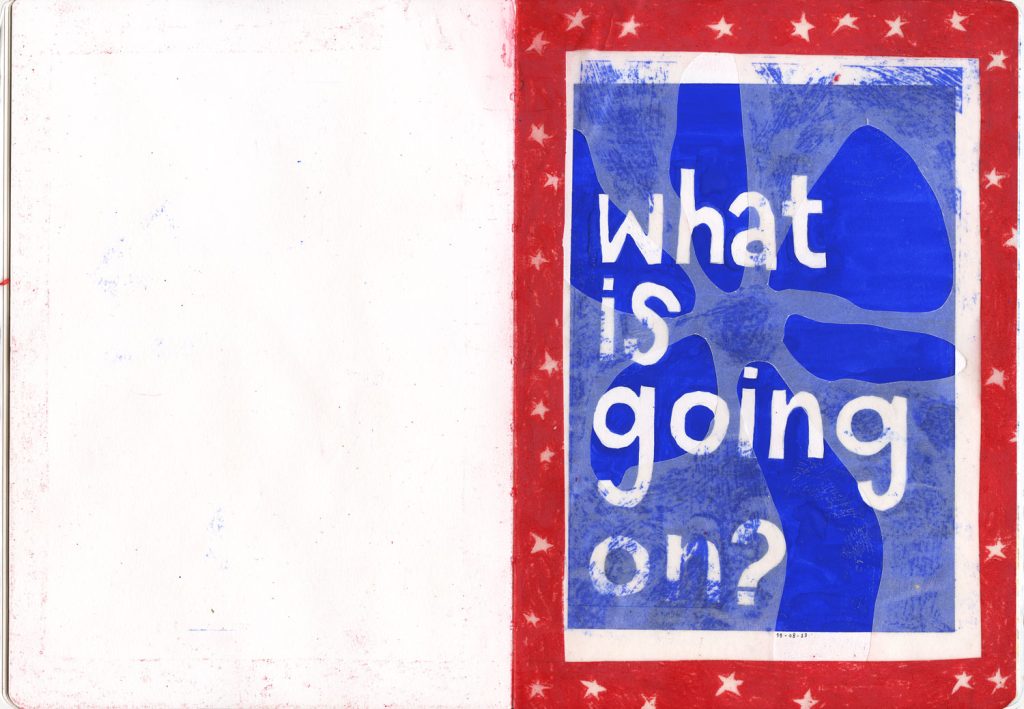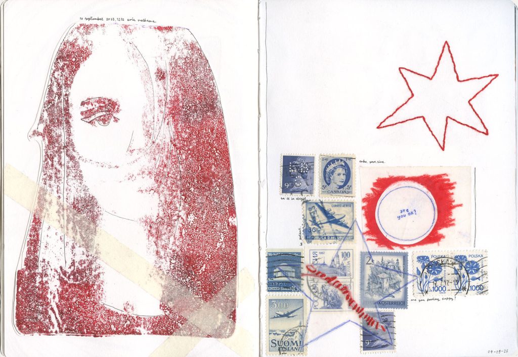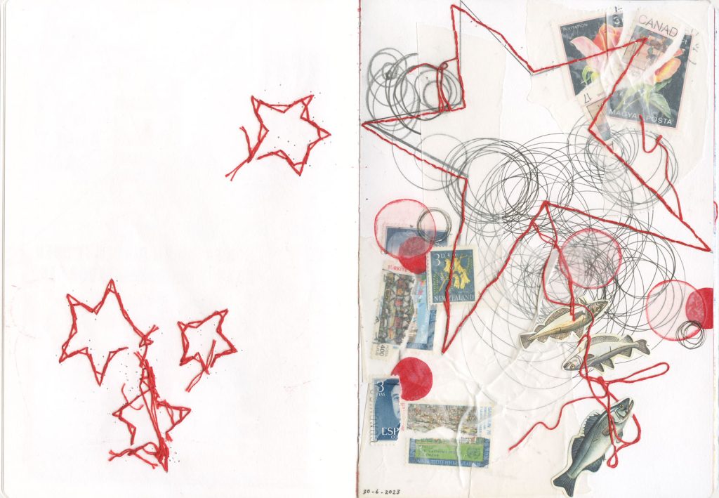 Op de linker kant van de pagina heb ik een monoprint gemaakt, en op de rechter pagina heb ik met dezelfde kleuren een bijpassende pagina gemaakt met allerlei verschillende materialen zoals postzegels, kalkpapier, potlood en borduurgaren.